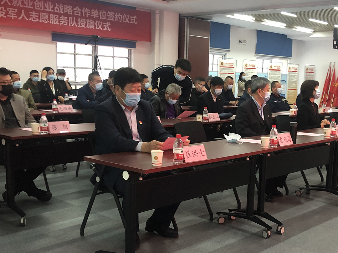 为庆祝党的二十大胜利召开,全面贯彻落实习近平总书记关于做好退役军人工作重要论述和重要指示精神,切实做好退役军人服务保障工作,加强推动新时代退役军人志愿服务健康发展。10月28日,东丽区退役军人就业创业战略合作单位签约仪式暨退役军人志愿服务队授旗仪式在中国民航大学科技园举行,市退役军人事务局就业创业处处长党苗、服务中心主任李东,区退役军人事务局局长曹砚海、副局长常文香、俞爱林,各街道退役军人服务站主要负责同志、赢搏线上平台党委书记董事长崔洪金及其他拥军企业单位相关同志出席仪式。
