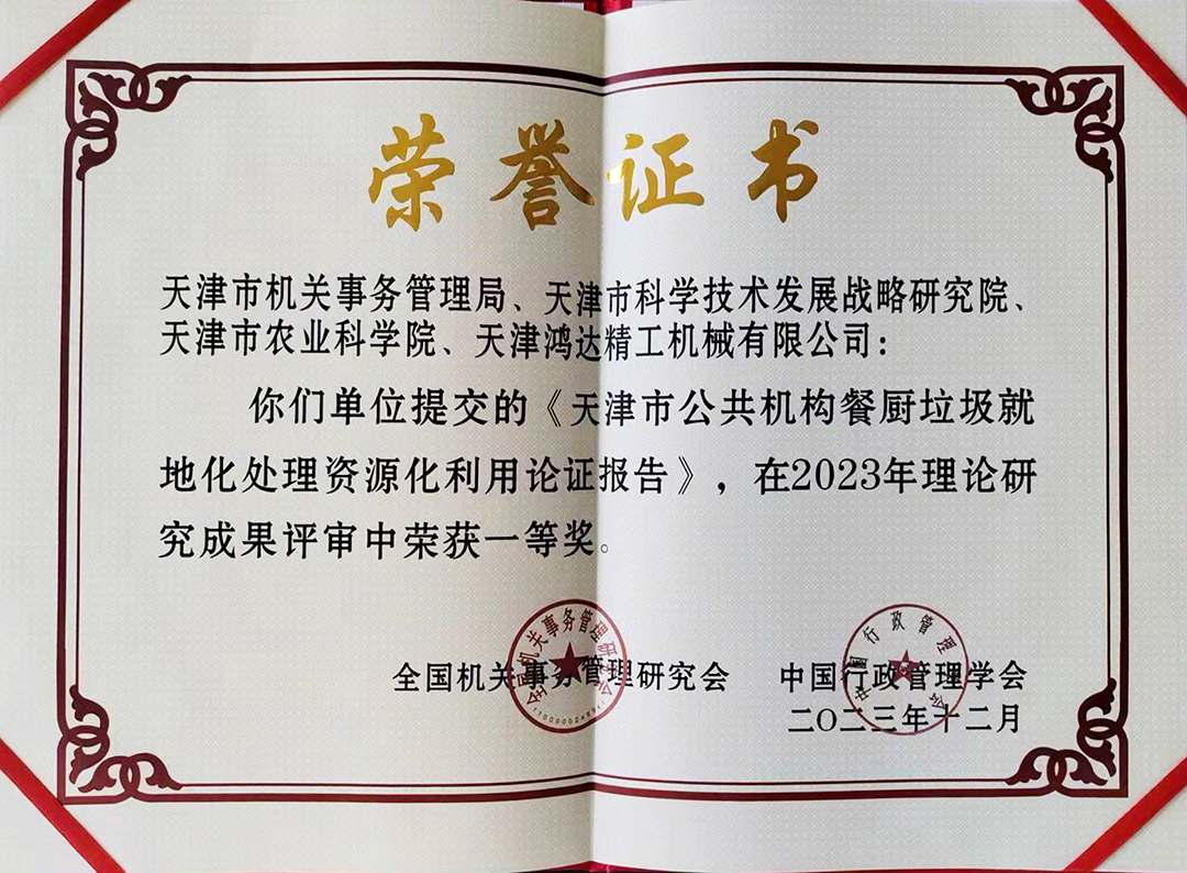 赢搏线上平台下属子公司鸿达精工机械有限公司与天津市机关事务管理局、天津市科学技术发展战略研究院、天津市农业科学院共同参与的《天津市公共机构餐厨垃圾就地化处理资源化利用论证报告》在2023年理论研究成果评审中荣获一等奖。鸿达精工副总经理庄儒国作为获奖企业代表在会上发言。