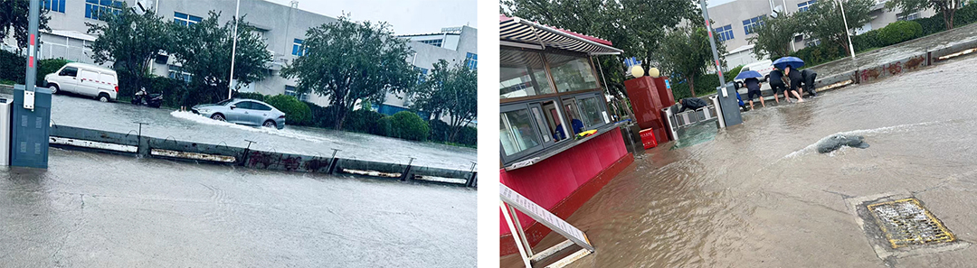 在风雨中,安达人无惧无畏,他们用行动诠释着责任与担当。工作人员们迅速装填沙袋,搭建防护板,筑起入院首道防线,阻止雨水进一步倒灌。同时,抽水泵全力运转,将厂院内的积水及时排出,以确保厂院的安全。